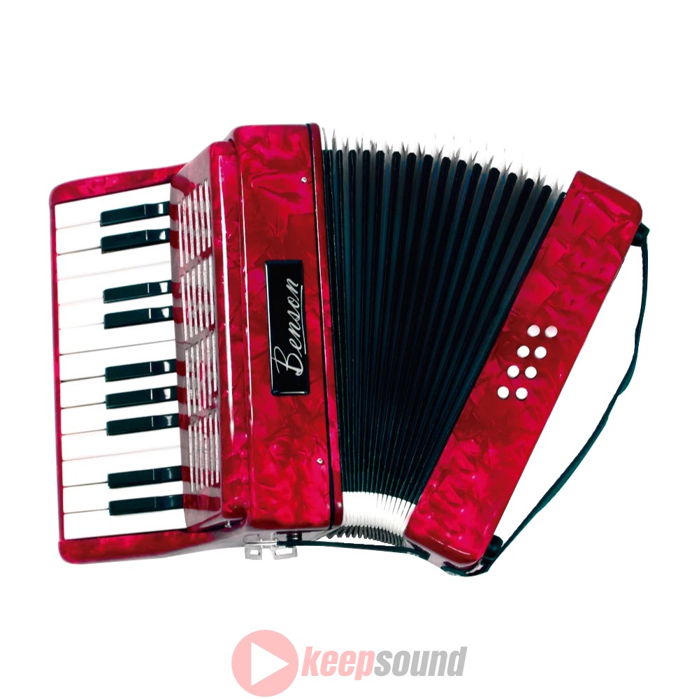 O acordeon Benson BAC08-PRD de 8 baixos (II de Voz, registro violin) e 22 teclas vem na cor vermelho perolado, e possui um mecanismo de resposta de tecla aprimorado que permite uma resposta tátil com mais resistência, garantindo ao acordeonista arpejos com alta precisão.  Seu formato reduzido permite horas de música com maior conforto e praticidade.
