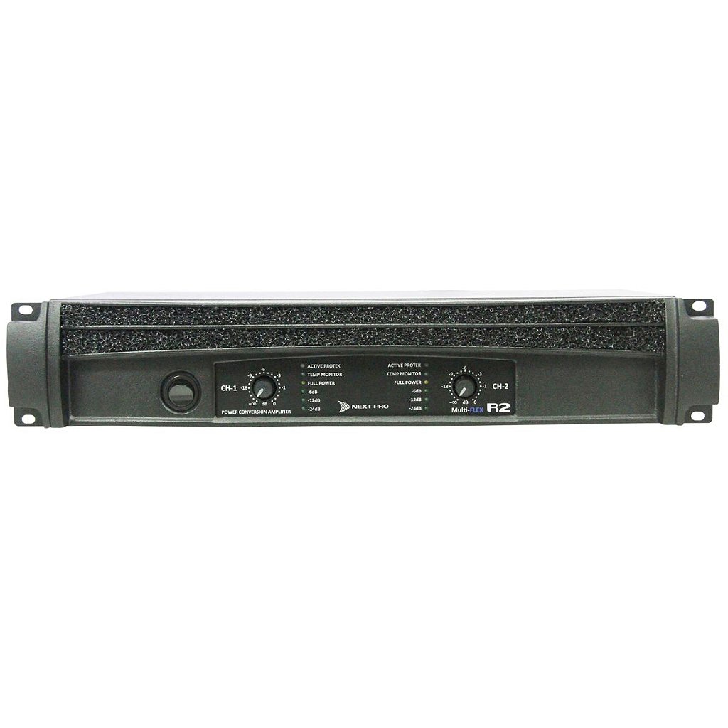 Com potência de 1000W + 1000W @ 2O ou 4O, a R2 é o primeiro modelo da série Pro-R a receber a inovadora e exclusiva tecnologia MultiFlex da Next Pro, além de todos os recursos dos modelos maiores da família. Com somente 5,5kg, está apta a qualquer aplicação dentro dos modernos sistemas de P.A., monitoração de palco e sistemas compactos.