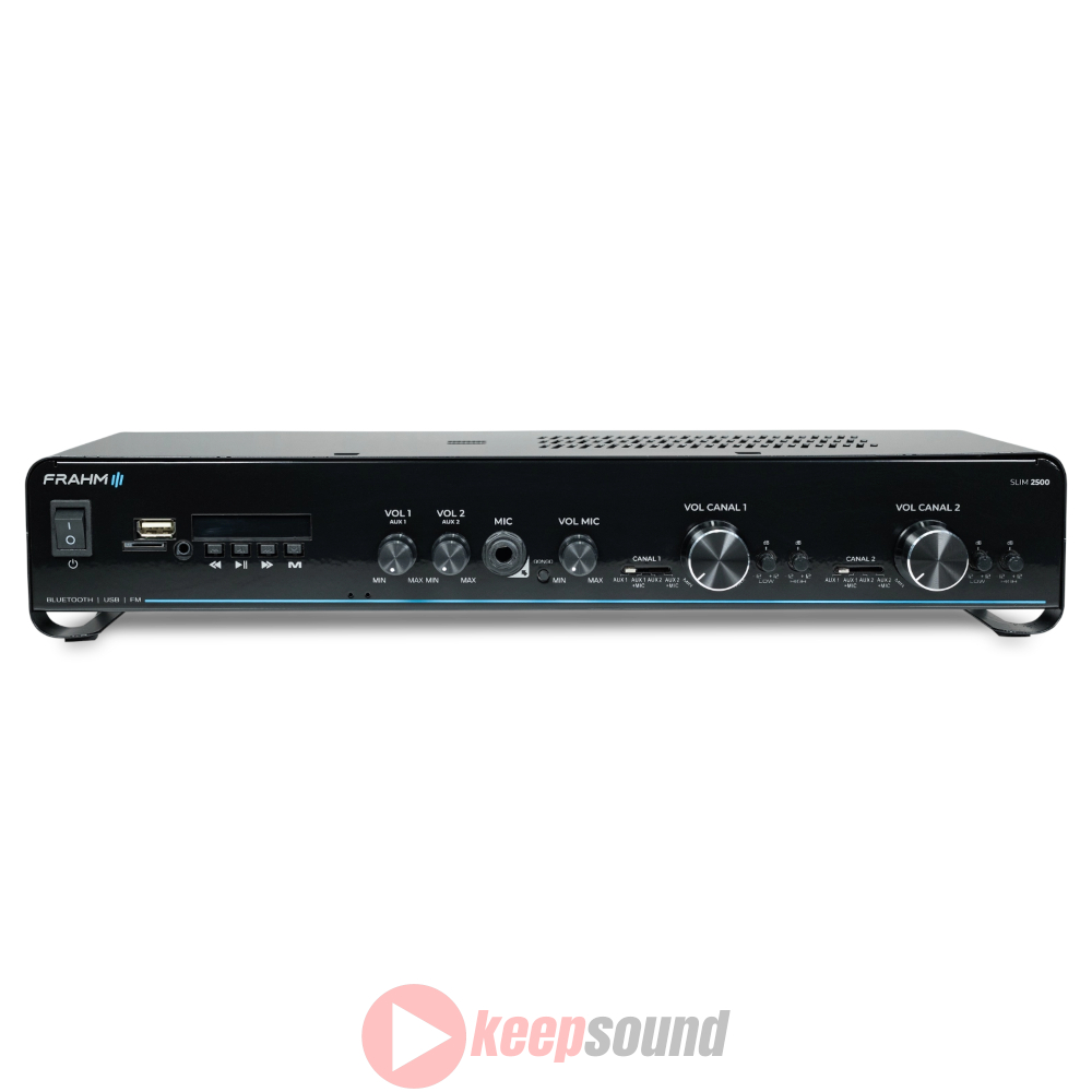 O amplificador Slim 2500 G5 com 160 Watts RMS de potência (2 canais de 80 W RMS). Amplificador que pode sonorizar 2 ambientes distintos, com músicas diferentes, pois possui dois canais Independentes e com controle de volume e equalizadores separados.