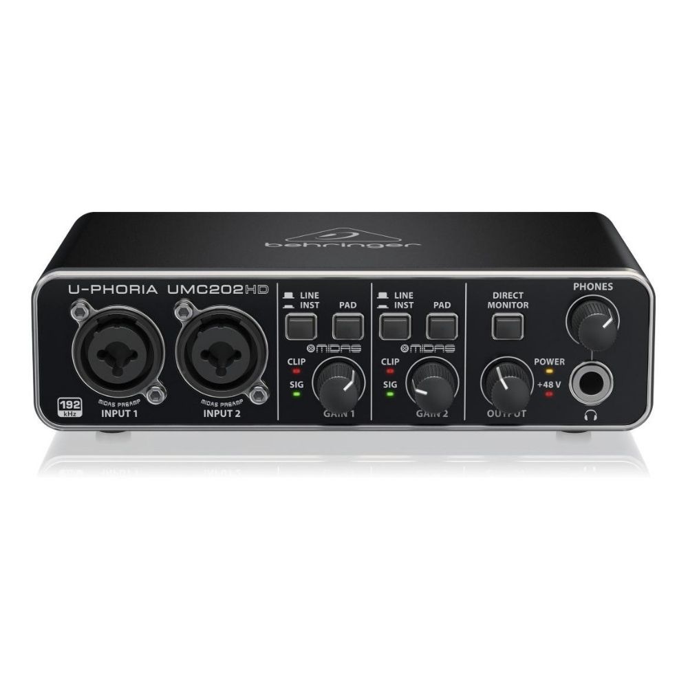 O U-PHORIA UMC202HD da Behringer é uma interface de áudio de entrada, dois saídas, USB 2.0 que possui pré-amplificadores projetados com MIDAS. Alimentado a partir do barramento USB, a interface entre plataformas inclui monitoramento direto de latência zero para gravação, indicadores LED para status, sinal e recorte e uma saída de fone dedicada com controle de volume.