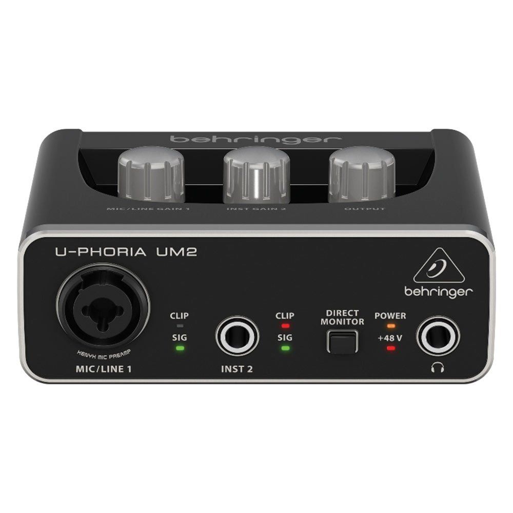 Behringer U-Phoria UM2 é uma interface de áudio com duas entradas frontais para instrumentos musicais (P10) ou microfones, contando com um pré-amplificador Xenyx de alta qualidade e phantom power para condensadores, além de duas saídas para monitores de referência e uma para fone de ouvido.