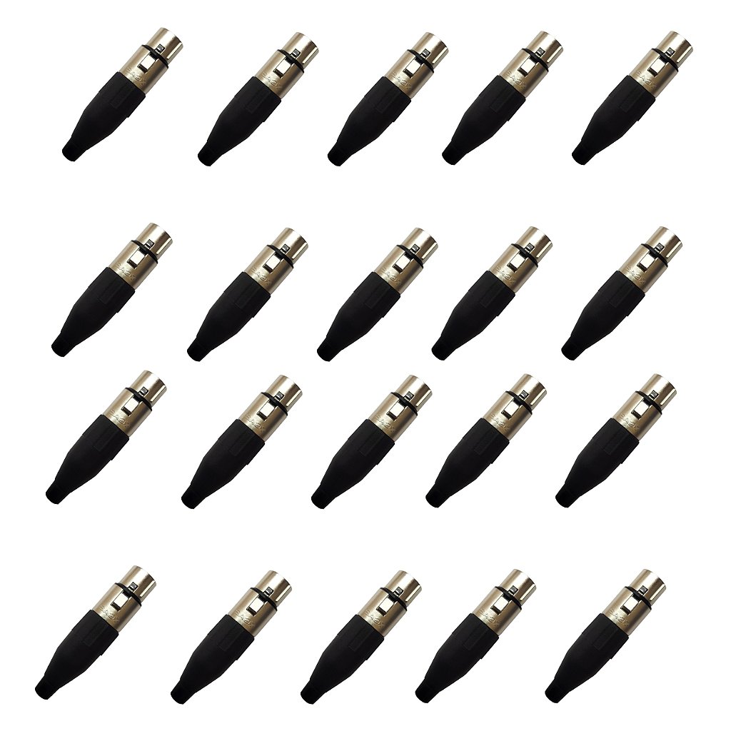 20 Plugs XLR fêmea linha com acabamento e contatos niquelados.