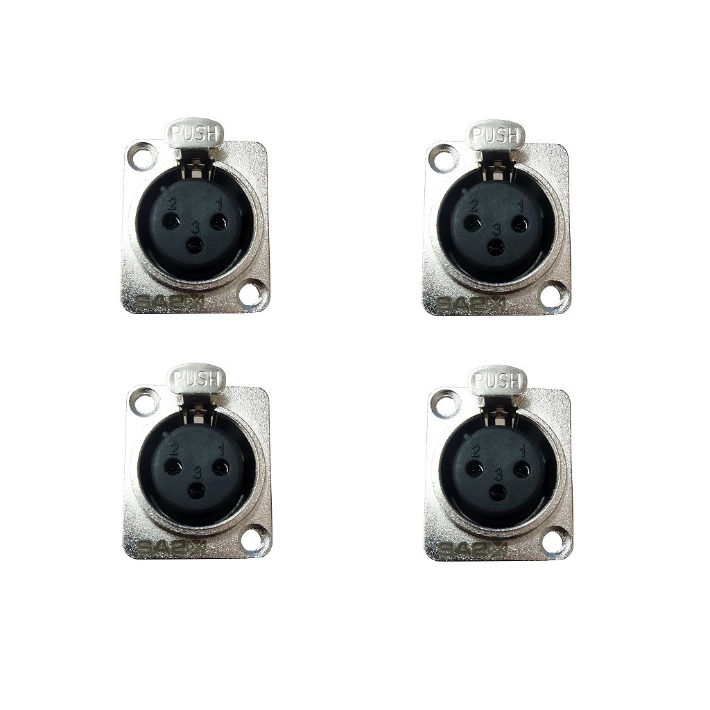 4 Conectores XLR fêmea painel com acabamento e contatos em níquel.