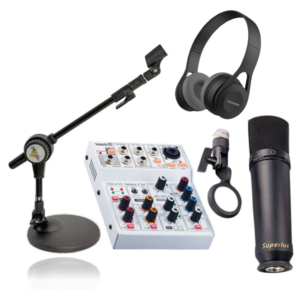 O kit é composto por um mini tripé girafa de mesa, um fone de ouvido dobrável tipo Over-Ea com cabo de 1.2m e isolamento sonoro, um misturador MX0402i interface de áudio compacto de comunicação USB 2.0 permite sua utilização com os melhores softwares de gravação do mercado, e um microfone condensador profissional CMH2D Superlux, proporciona excelente qualidade de transmissão sem ruídos com microfones de alta performance e grande aproveitamento de captação.