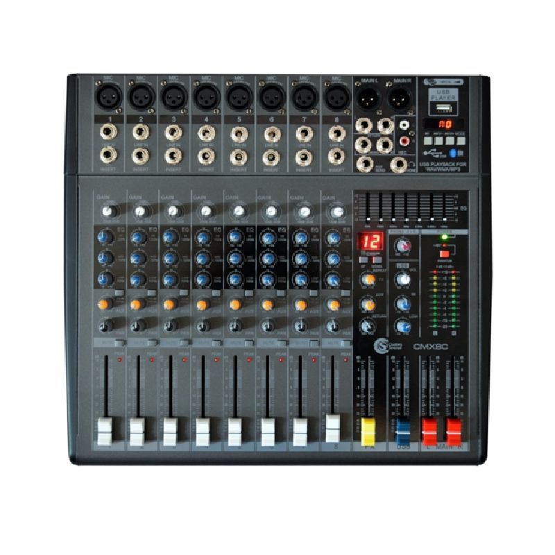 A Mesa de Som Custom Sound CMX 8C é membro da nova linha de mesas de som CMX da Custon Sound, com recursos que vem para facilitar a vida de quem trabalha com áudio. Seus canais contam com entrada XLR, Insert e Line In, para você conectar seus instrumentos e microfones, podendo controlar o ganho, grave, médio, agudo dos canais, além do AUX, pan, mute e um LED indicador de sinal (Peak) de cana canal, permitindo um melhor gerenciamento e mixagem do seu áudio!