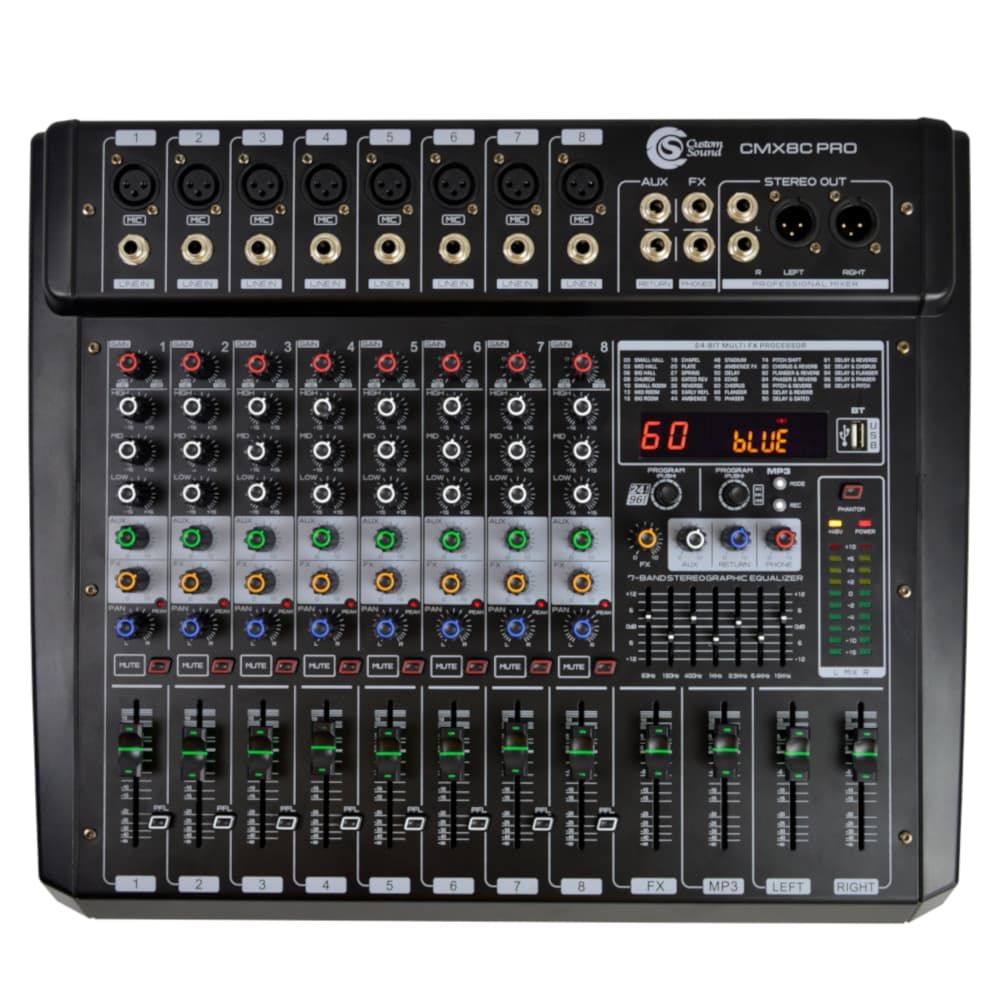 Mesa de Som Custom Sound CMX 8C Pro! Esse incrível modelo da conta com 8 entradas XLR e 8 entradas Line In para você conectar seus microfones e instrumentos, podendo controlar os parâmetros sonoros na hora das apresentações! Controle o ganho do sinal, além dos graves médios e agudos, o AUX, FX e PAN tudo direto dos 8 canais da CMX 8C Pro!