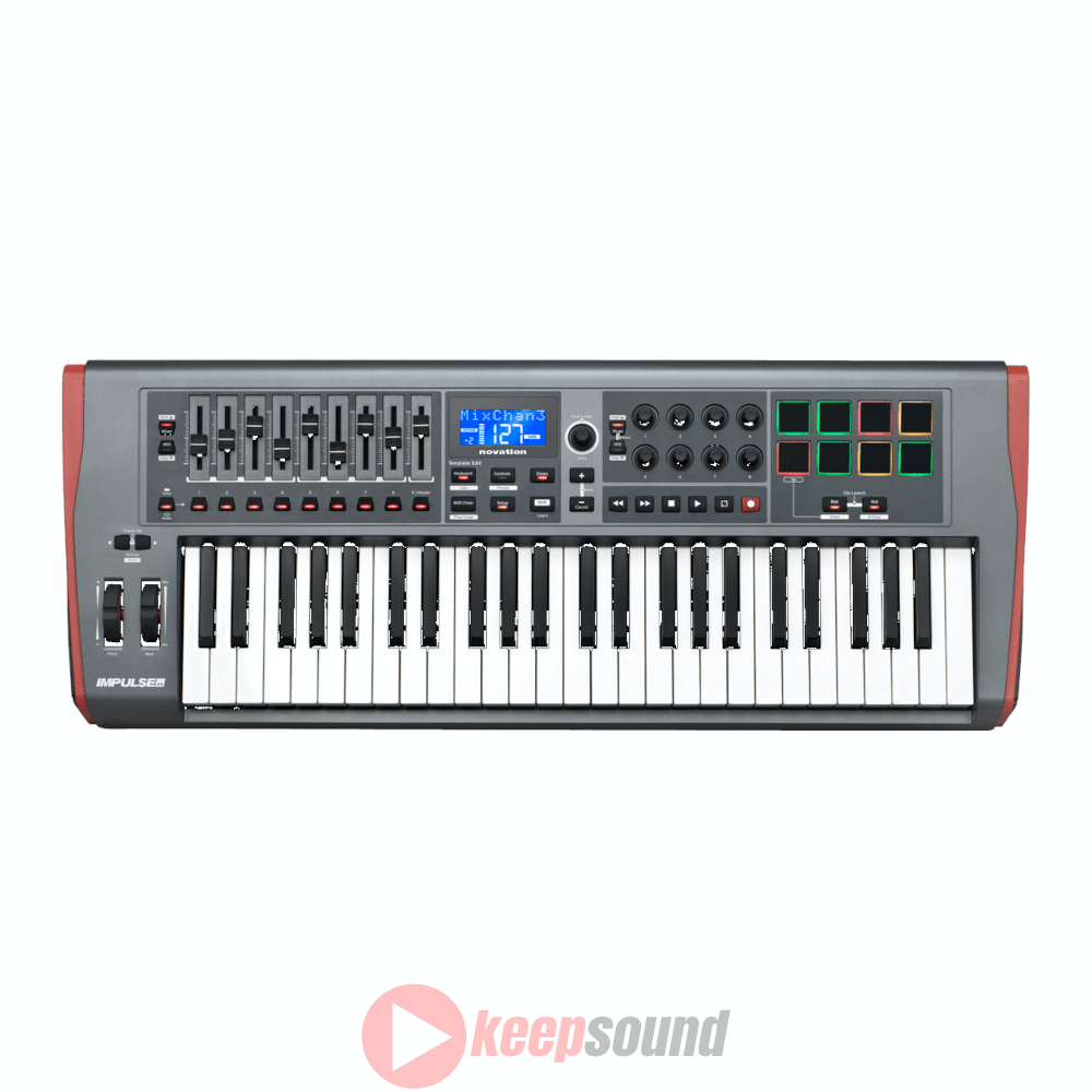 O Impulse 49 é um teclado controlador USB MIDI com 49 teclas de ação semi-pesada, com aftertouch, 8 knobs rotação infinita, 9 faders, 8 pads retroiluminados, mod wheel e pitch wheel.